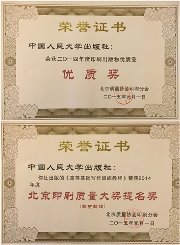 北京印刷质协2015年质量工作会议于2015年3月26日在京召开,人大社荣获“2014年度印刷出版物优质品优质奖”。这是出版社自2011年成为北京印刷质协会员单位以来,连续第四次获此殊荣。由北京昌联印刷有限公司承印的人大社《高等基础写作训训练教程》荣获“2014年度北京印刷质量大奖提名奖”(教材教辅类)。此外,人大社284个图书品种被评为“2014年度印刷出版物优质产品”。