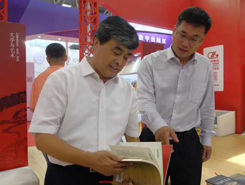 8月29日,国家新闻出版广电总局副局长吴尚之、进口管理司司长蒋茂凝等参观人大社展台,中国人民大学出版社社长李永强陪同讲解。